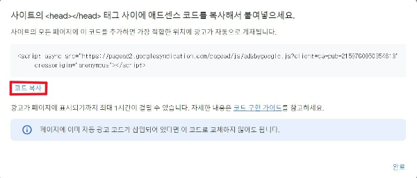 [코드 가져오기]를 클릭하면 친절하게 스킨편집에 가서 <head></head> 사이에 코드를 복사해서 넣으라고 알려주는 창이 뜹니다. 저희는 빨간 네모 박스에 있는 코드 복사하기만 눌러주시면 됩니다.