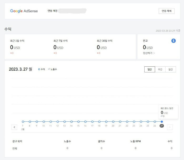 메뉴 <수익>에서 애드센스 관리를 누르게 되면 더 상세히 볼 수가 있습니다. 하위블로그에도 애드센스 연동이 되었기 때문에 메인블로그에서 했던 광고설정을 이곳에도 똑같이 적용시켜주어야 합니다.